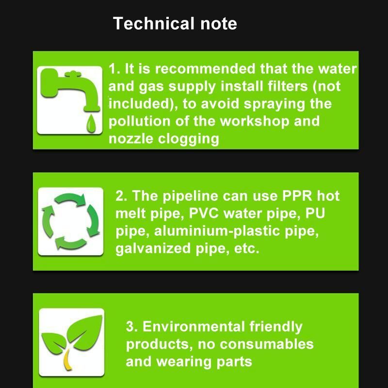 1. It is recommended that the water and gas supply install filters (not included), to avoid spraying the pollution of the workshop and nozzle blockage