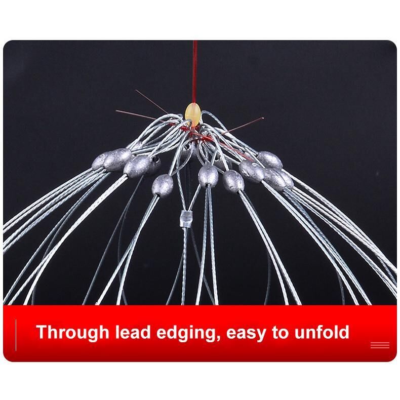 1. Ξδιπλώνεται αυτόματα μετά την είσοδο στο νερό, κάτι που είναι βολικό για ρίψεις μεγάλης απόστασης και ψάρεμα σε γλυκά νερά. 2. Το δίχτυ γίνεται γρήγορα σφαιρικό, με πυκνές τρύπες πλέγματος, και το κλουβί κλείνει γρήγορα για να αποτρέψει τη διαφυγή των καβουριών. 3. Η δύναμη κατανέμεται ομοιόμορφα και το πλαίσιο είναι συμπαγές, σταθερό και ανθεκτικό. 4. Ευέλικτο σώμα από ατσάλινο σύρμα, με πλήρη σημεία συγκόλλησης. 5. Επένδυση με μολύβδο στον πυρήνα, για εύκολο άνοιγμα. 6. Το δίχτυ κλείνει γρήγορα και σταθερά, με τέσσερις γραμμές κατανεμημένες ομοιόμορφα, και το κλείσιμο είναι ομαλό και σταθερό. 7. Υλικό: ανοξείδωτο ατσάλι, μολύβδι, νάιλον γραμμή. 8. Βοηθητικά υλικά: 16 πλεξίδες/20 πλεξίδες. 9. Συσκευασία: σακούλα με φυσαλίδες. 10. Σημείωση: Η παράδοση περιλαμβάνει μόνο το κλουβί ανοίγματος και κλεισίματος, όχι άλλα αντικείμενα στην εικόνα!