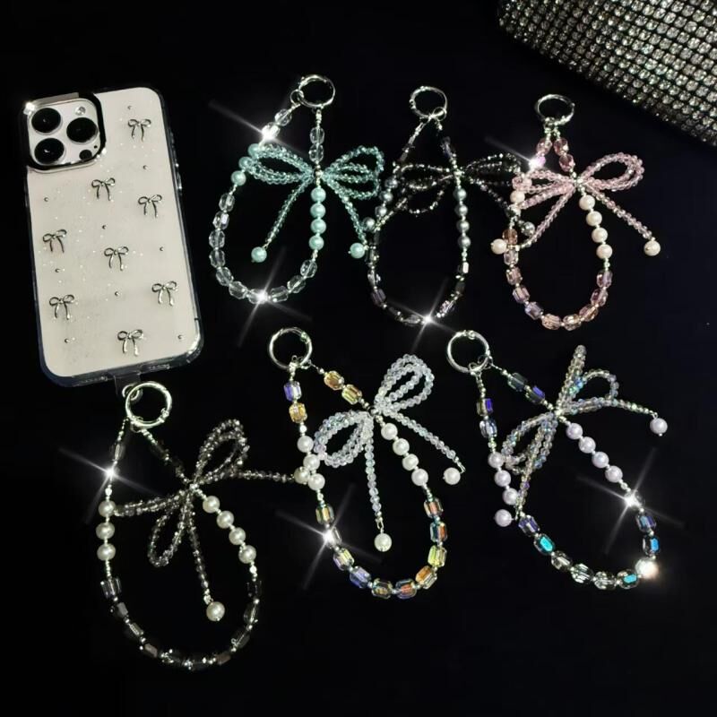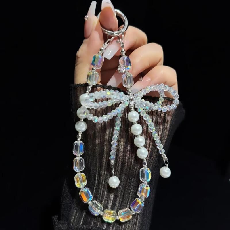 Diamond Crystal Bow Crystal Pearl Phone Chain(White)