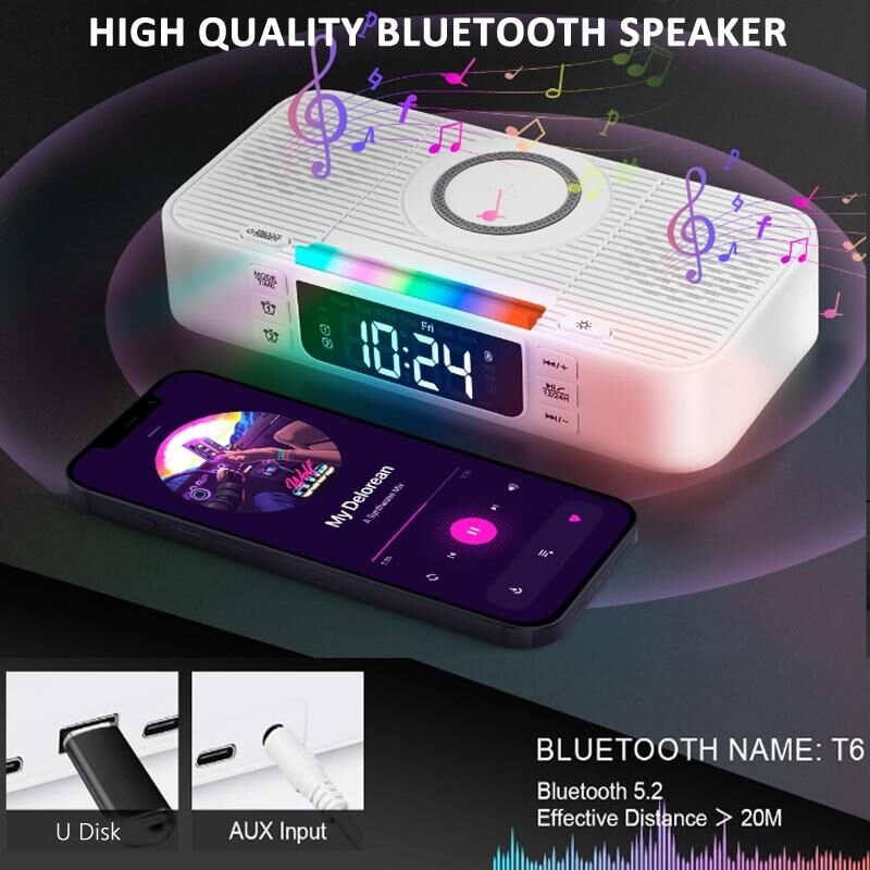 4. The top of the alarm clock is designed with LED RGB lights, which can be adjusted to 7 color modes. Perfect for placing on a bedside table in the bedroom as an ambient light.
