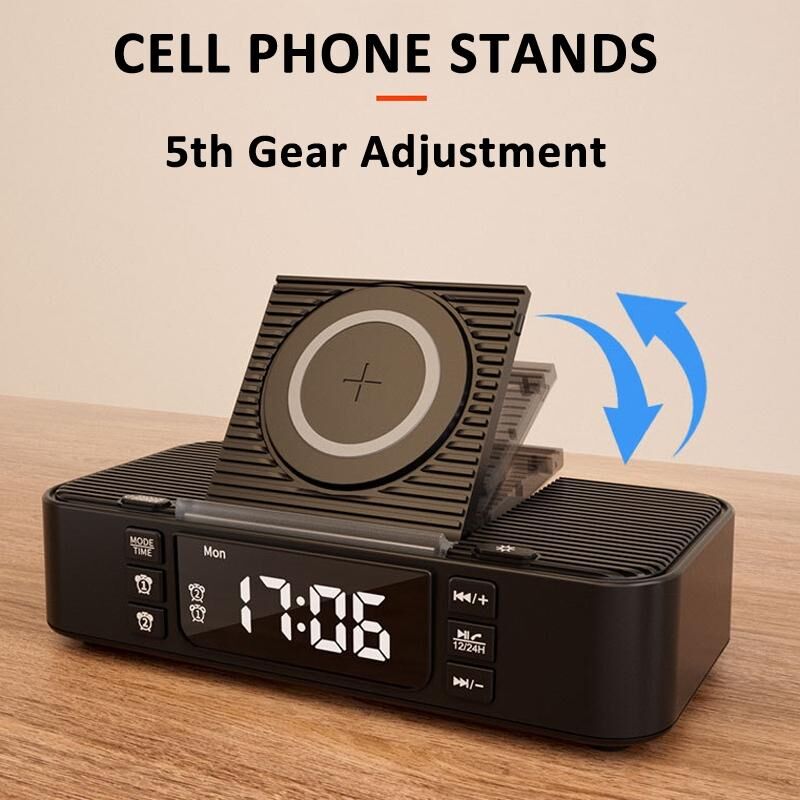 5. The wireless charging module above the alarm clock can be flipped and transformed into a mobile phone holder with 5 levels of adjustment. You can charge your phone while watching videos.