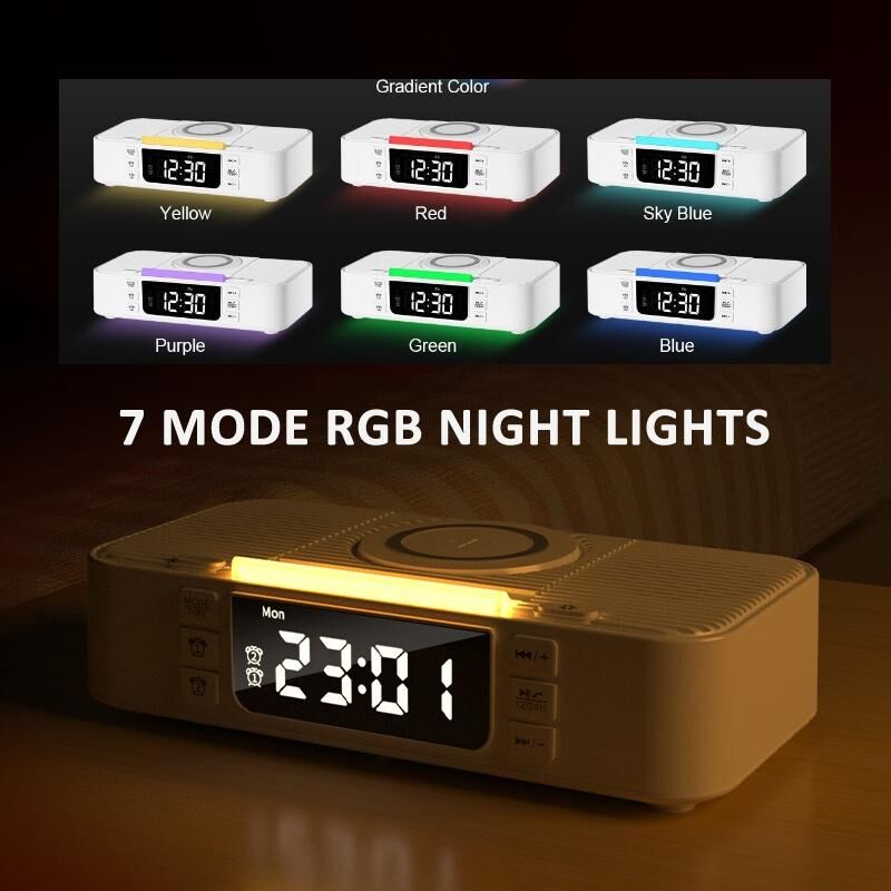 4. Η κορυφή του ξυπνητηριού είναι σχεδιασμένη με LED φώτα RGB, τα οποία μπορούν να ρυθμιστούν σε 7 χρωματικούς τρόπους. Ιδανικό για τοποθέτηση σε ένα κομοδίνο στην κρεβατοκάμαρα ως ατμοσφαιρικός φωτισμός.
