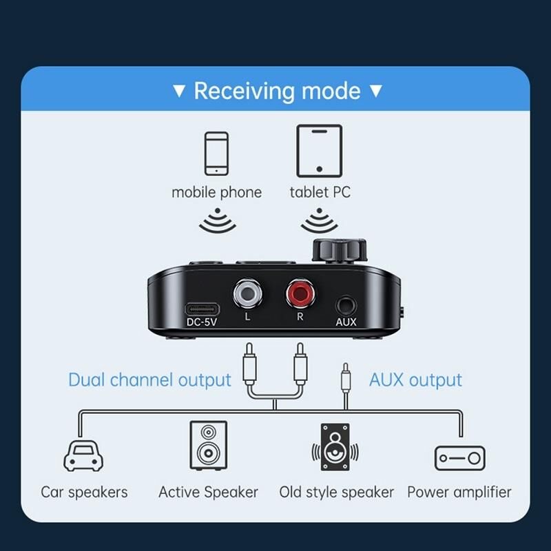 14. Receiving + transmitting in one: TX transmitting mode, computer/TV upgrade Bluetooth compatible, easy to connect Bluetooth compatible earphones/speakers, solve the problem that TV cannot connect Bluetooth compatible earphones; RX receiving mode, easy to connect mobile phones/tablets, old speakers/ The Bluetooth compatible function of the power amplifier can be connected to the audio interface of the old speaker or power amplifier to solve the problem of incompatibility with Bluetooth and the inability to use Bluetooth compatible playback