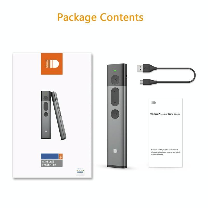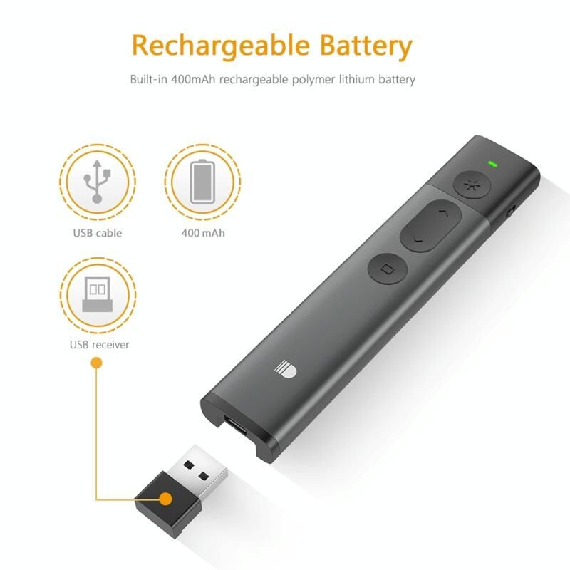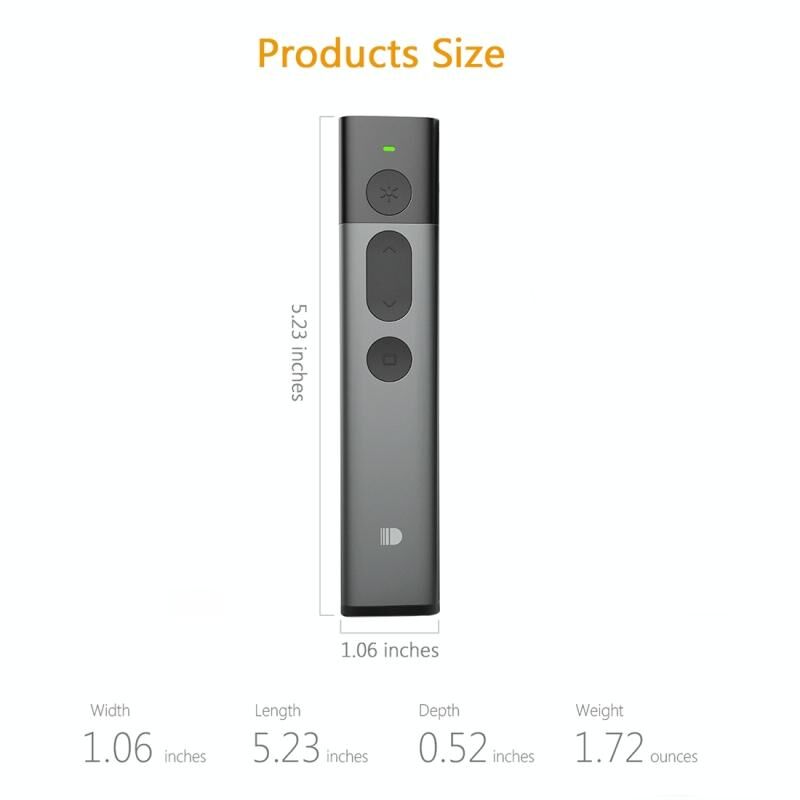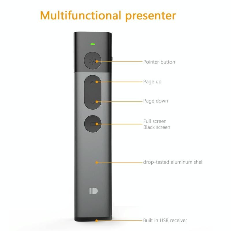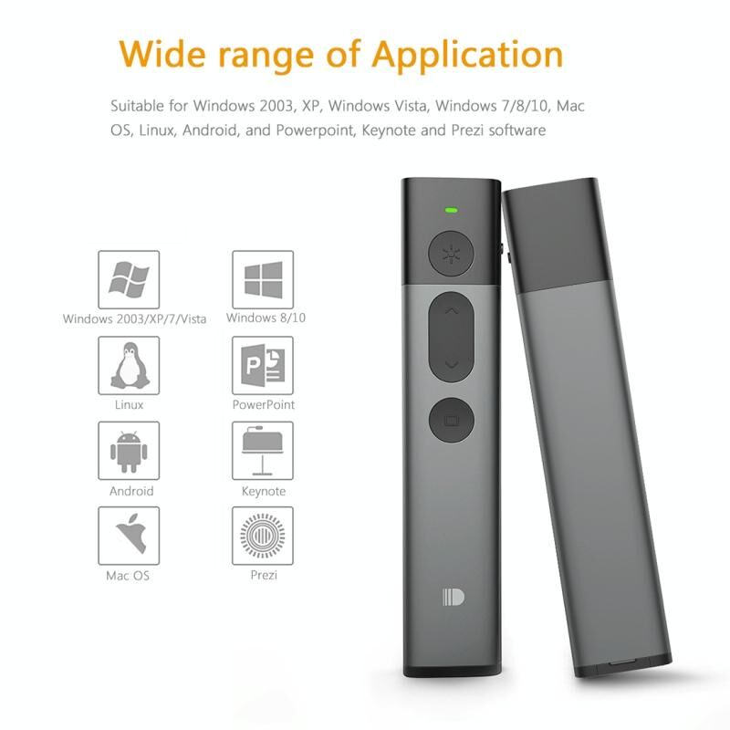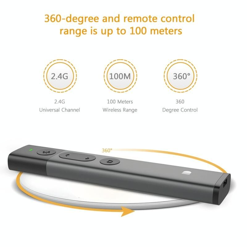 4. Ασύρματος παρουσιαστής, εξοπλισμένος με κορυφαίο μικροτσίπ, με ασύρματη εμβέλεια έως και 100 μέτρα. Λειτουργεί στη συχνότητα 2.4G RF, η οποία είναι μια ελεύθερη συχνότητα ISM και μπορεί να χρησιμοποιηθεί παγκοσμίως.
