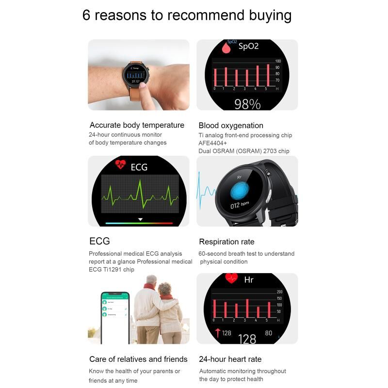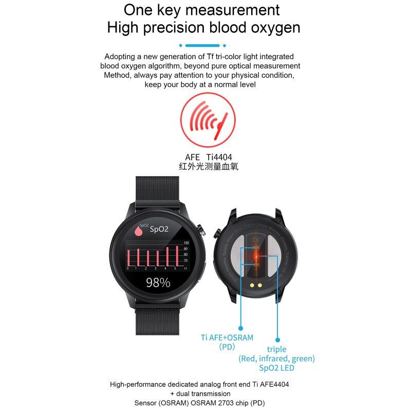 11. Function: female health (menstrual cycle), body temperature monitoring and warning, blood oxygen monitoring, respiration rate, blood pressure monitoring, exercise pedometer, alarm clock, call reminder, calories, distance, alarm clock reminder, etc.
