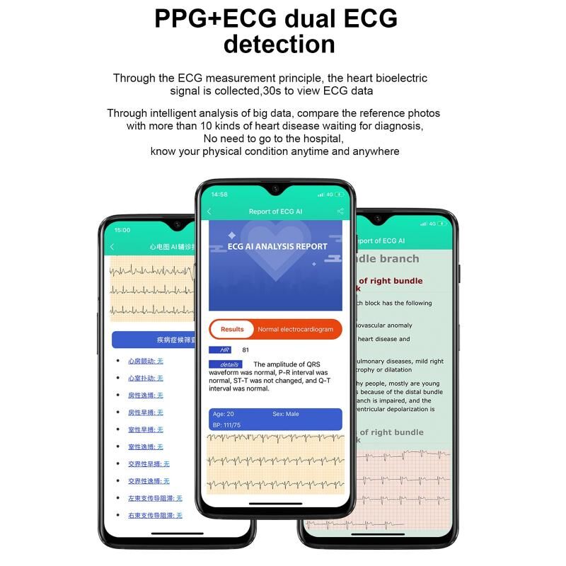 16. Function: Multi-sports mode, heart rate monitoring, blood pressure monitoring, ECG function, AI medical diagnosis, body temperature monitoring, blood oxygen monitoring, breathing rate, remote care of relatives and friends, shake to take pictures, information reminder, music control, stopwatch, step counter Wait