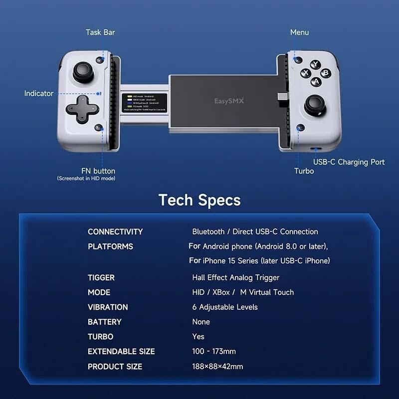 1. Comprehensive Compatibility: The M05 controller is suitable for a variety of Android devices and iPhones (series 15 or later with USB-C plug), ensuring unparalleled game compatibility. In addition, its clever design effectively avoids blocking the lens of most mainstream smartphones, making it easy to use even with a phone case.