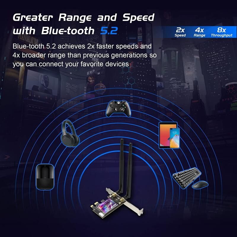 3. Τεχνολογία Bluetooth 5.2 --Η τελευταία τεχνολογία 5.2 που επεκτείνει την εμβέλεια του σήματος Bluetooth 4 x, δεν χρειάζεται να ανησυχείτε ότι το σήμα θα είναι αδύναμο στο δωμάτιο και να περιμένετε πολύ χρόνο για τη μεταφορά μεγάλων αρχείων, το Bluetooth 5.2 θα λύσει αυτό το πρόβλημα και μπορεί να συνδεθεί με ποντίκι, ακουστικά, πληκτρολόγιο και άλλες συσκευές Bluetooth (Σημείωση: πρέπει να συνδέσετε το καλώδιο τροφοδοσίας στη θύρα 9-pin της μητρικής πλακέτας για τη λειτουργία Bluetooth).