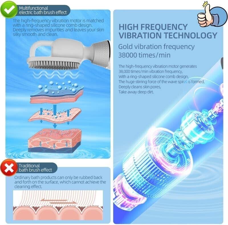 4. Η κεφαλή της βούρτσας μπάνιου είναι κατασκευασμένη από αντιβακτηριακό, φιλικό προς το δέρμα και φιλικό προς το περιβάλλον υλικό σιλικόνης, το οποίο έχει απαλή αφή, απαλό αφρισμό χωρίς να βλάπτει το δέρμα, μοναδική διάταξη κυκλικών τριχών βούρτσας, κυματιστό σπειροειδές μασάζ, βαθύ καθαρισμό χωρίς υπολείμματα και μια καλύτερη εμπειρία μπάνιου·