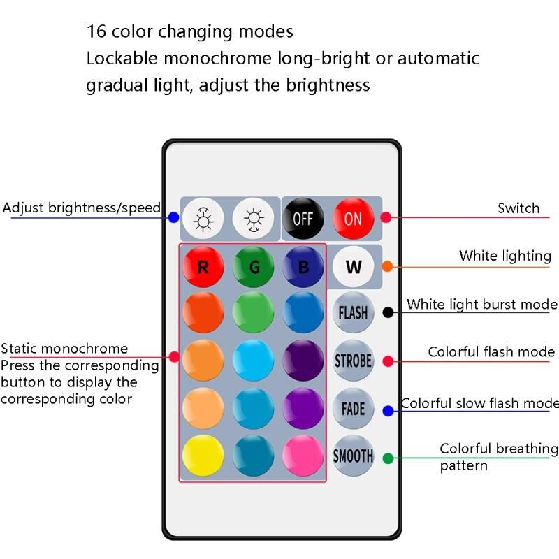 9. 16 λειτουργίες αλλαγής χρώματος, δυνατότητα κλειδώματος ενός σταθερού χρώματος ή αυτόματης σταδιακής αλλαγής φωτός, ρύθμιση φωτεινότητας, υψηλής απόδοσης φωτισμός, πλούσιο φως, υψηλή απόδοση χρωμάτων, ομοιόμορφο φως, ανθεκτικό, ευρεία εφαρμογή
