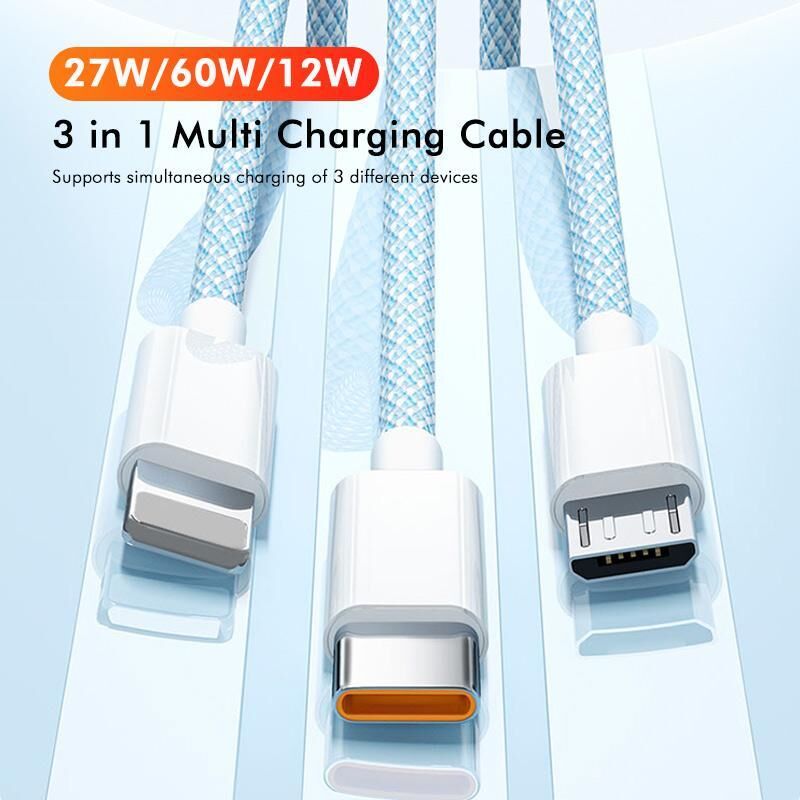 1. 3-in-1 Universal Compatibility: Equipped with all essential charging connectors, featuring 8 Pin, USB-C, micro connectors, this cable charges IP & android smartphones, tablets, and all other USB-powered devices. One cable for all your devices!
