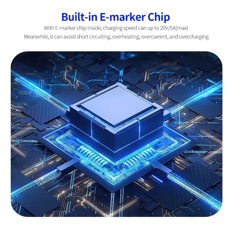 1. Γρήγορη φόρτιση 100W & Ενσωματωμένο τσιπ E-marker: Πλήρως συμβατό με τα πρωτόκολλα FCP και QC3.0, υποστηρίζει ισχύ εξόδου έως 5A 20V για γρήγορη φόρτιση. Το τσιπ E-marker ρυθμίζει αυτόματα το ρεύμα και εξασφαλίζει γρήγορη και ασφαλή φόρτιση της συσκευής σας.