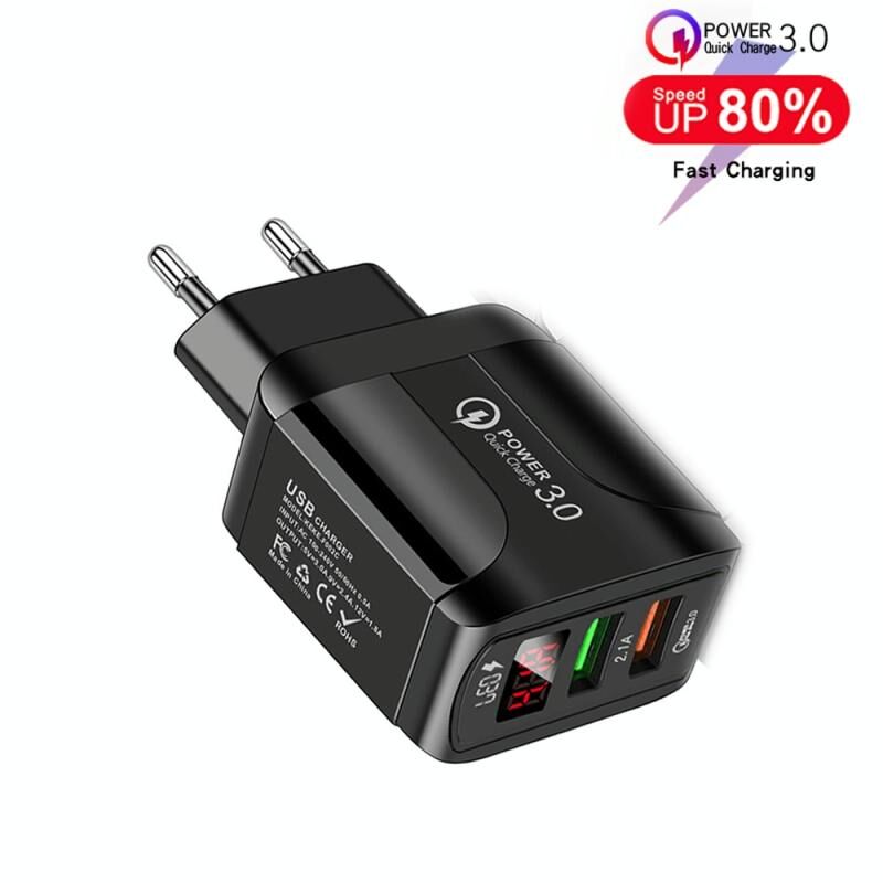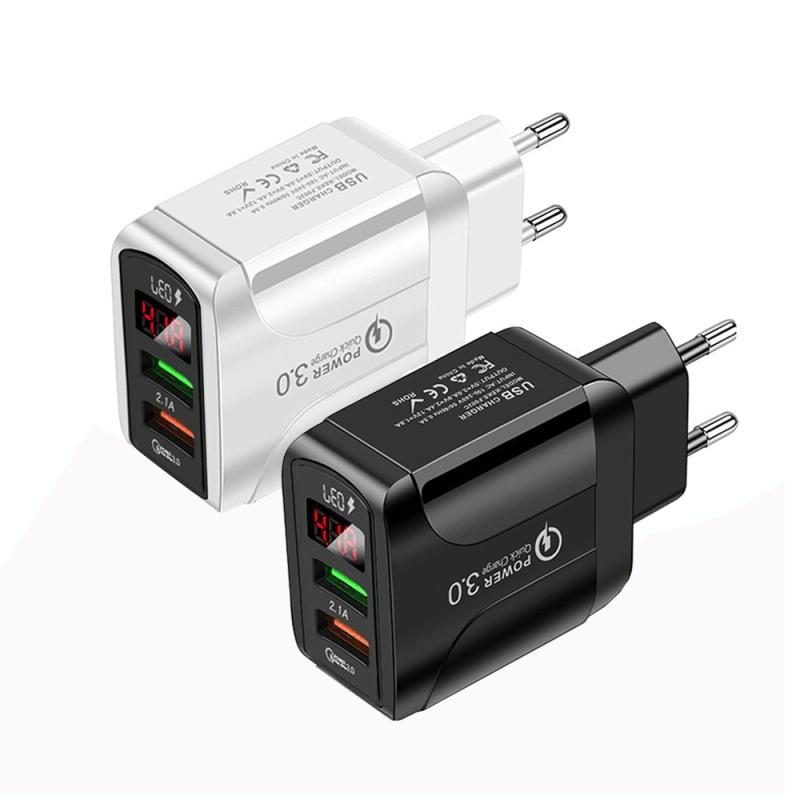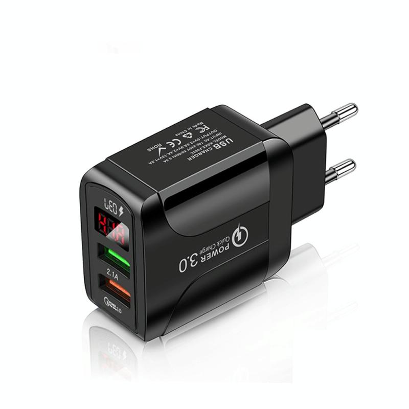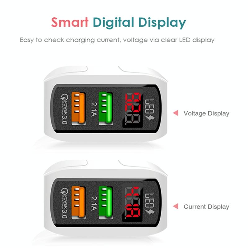 F002C QC3.0 USB + USB 2.0 Fast Charger with LED Digital Display for Mobile Phones and Tablets, EU Plug(Black)