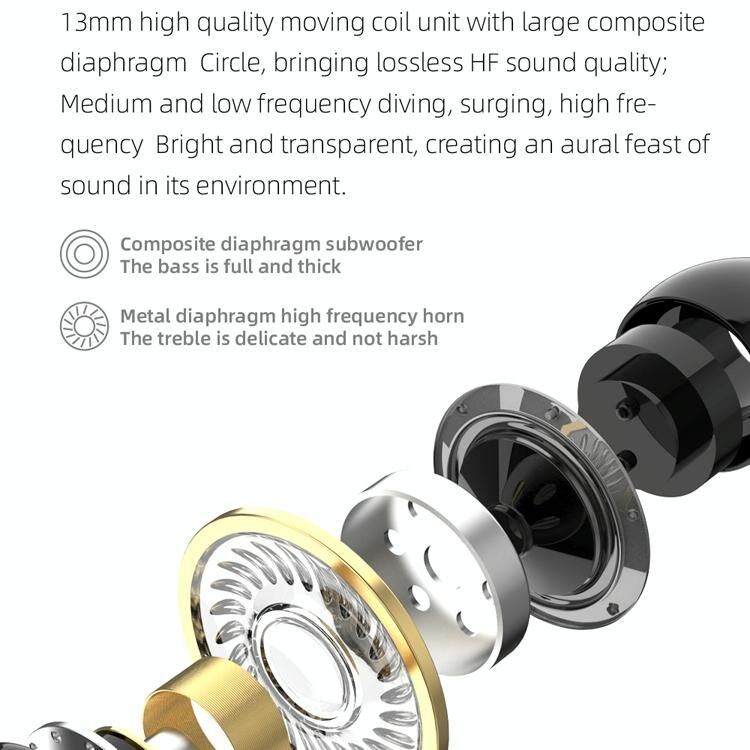 5. Κινητή μονάδα 13mm, με μεγάλη σύνθετη μεμβράνη κινητής περιέλιξης, προσφέροντας lossless ποιότητα ήχου HF, βαθιά και μέση συχνότητα βουτιάς και υψηλή συχνότητα φωτεινή και διαφανή