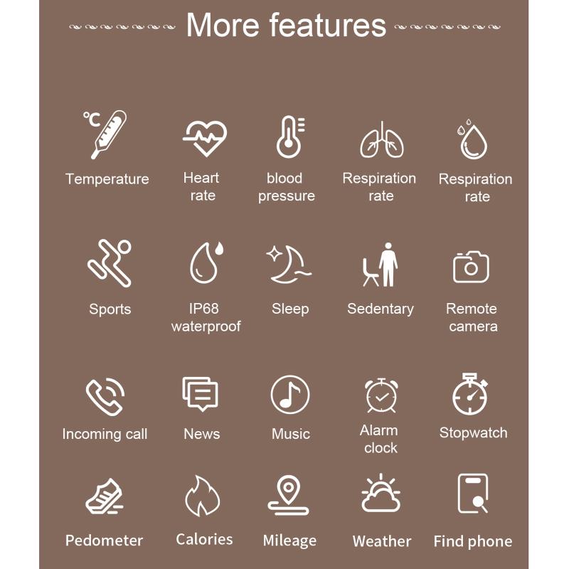 11. Λειτουργία: υγεία γυναικών (εμμηνορροϊκός κύκλος), παρακολούθηση και προειδοποίηση θερμοκρασίας σώματος, οθόνη αφής πλήρους κύκλου, δυναμικό UI, παρακολούθηση οξυγόνου αίματος, ρυθμός αναπνοής, παρακολούθηση αρτηριακής πίεσης, βήματα/θερμίδες/απόσταση, λειτουργία πολλαπλών αθλημάτων, λειτουργία απομακρυσμένης φροντίδας, υπενθυμίσεις εισερχόμενων κλήσεων, υπενθυμίσεις πληροφοριών κ.λπ.