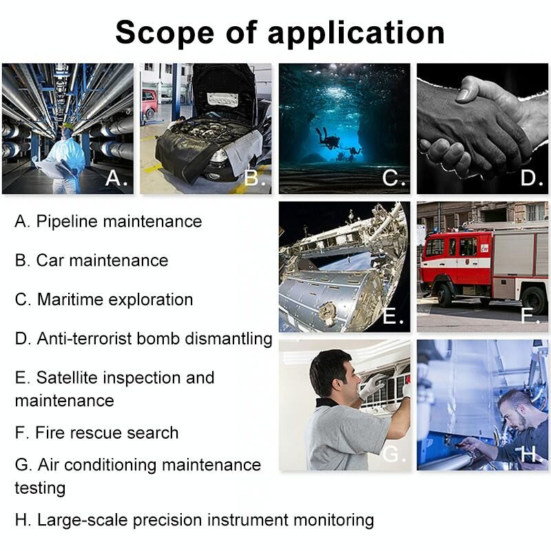 16. Scope of application: pipeline maintenance, vehicle maintenance, maritime exploration, anti terror bomb removal, satellite maintenance and repair, fire rescue search, air conditioning maintenance and testing, large-scale precision instrument monitoring