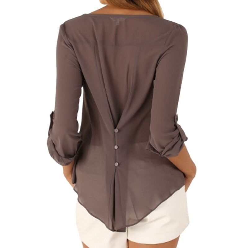 Γυναικεία ευρωπαϊκή και αμερικανική κομψή V λαιμό μακρύ μανίκι χαλαρή μπλούζα σιφόν, μέγεθος: (Καφές)