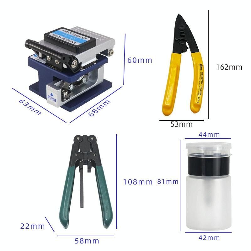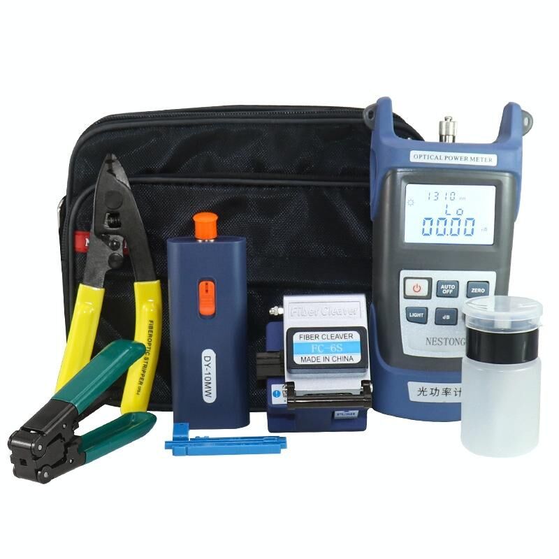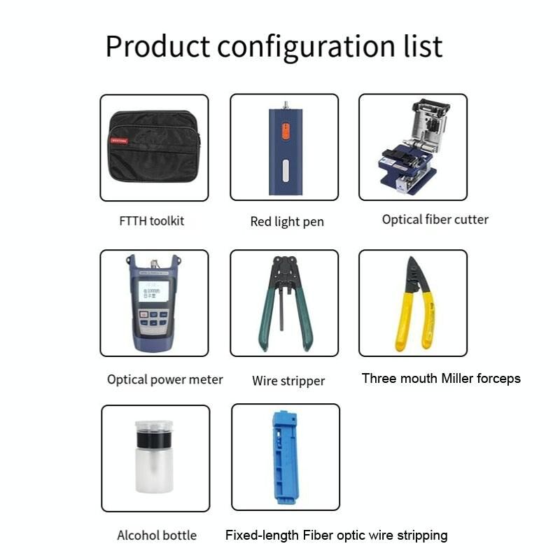 Λίστα κιτ εργαλείων: Κιτ εργαλείων FTTH, κόκκινη γραφίδα, κόφτης ινών, μετρητής οπτικής ισχύος, απογυμνωτής καλωδίων, πένσα Miller τριών στομίων, μπουκάλι αλκοόλ, στερεωτής μήκους