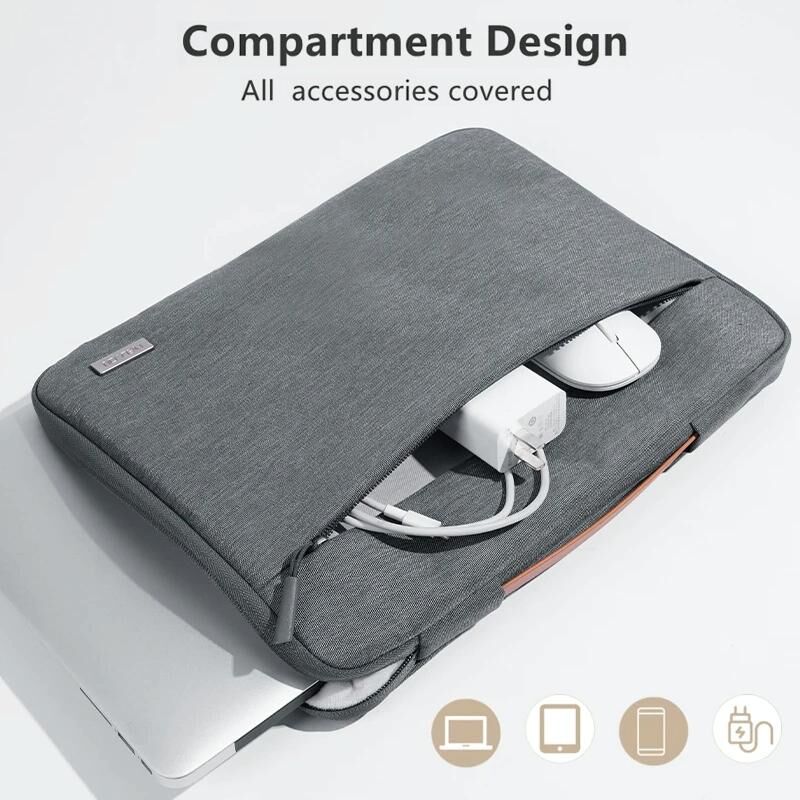4. Πολυεπίπεδη Προστασία: Το εξωτερικό στρώμα υφάσματος προστατεύει από σκόνη, βρωμιά, υπολείμματα και γρατζουνιές. Η επενδυμένη θήκη μεταφοράς υπολογιστή προσφέρει προστασία από χτυπήματα, κουνήματα και εξώθηση όταν τοποθετείται σε σακίδιο ή βαλίτσα.