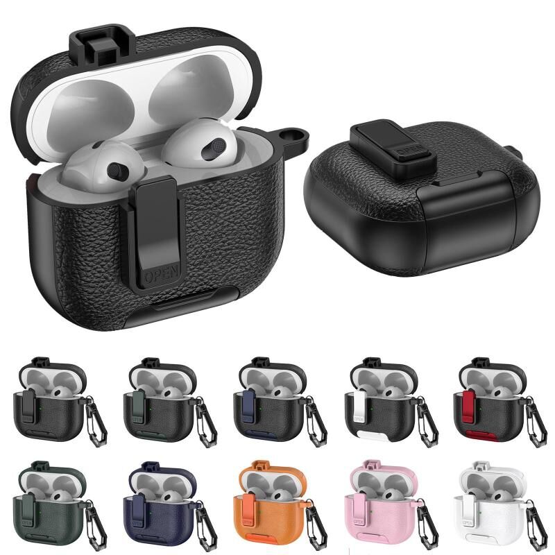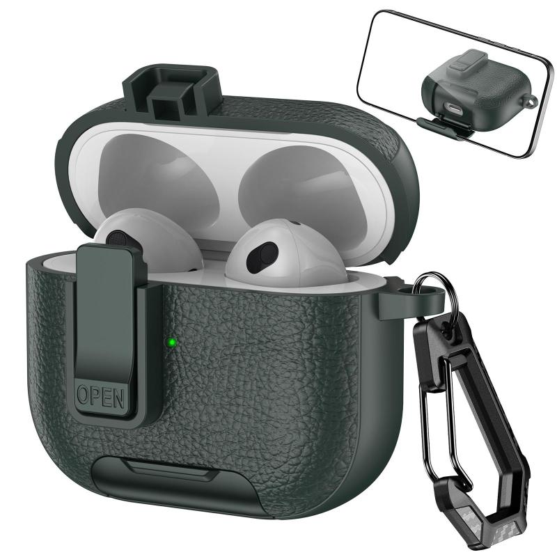 For AirPods 3 Leather Texture Wireless Earphones Case with Hook & Holder(Army Green)