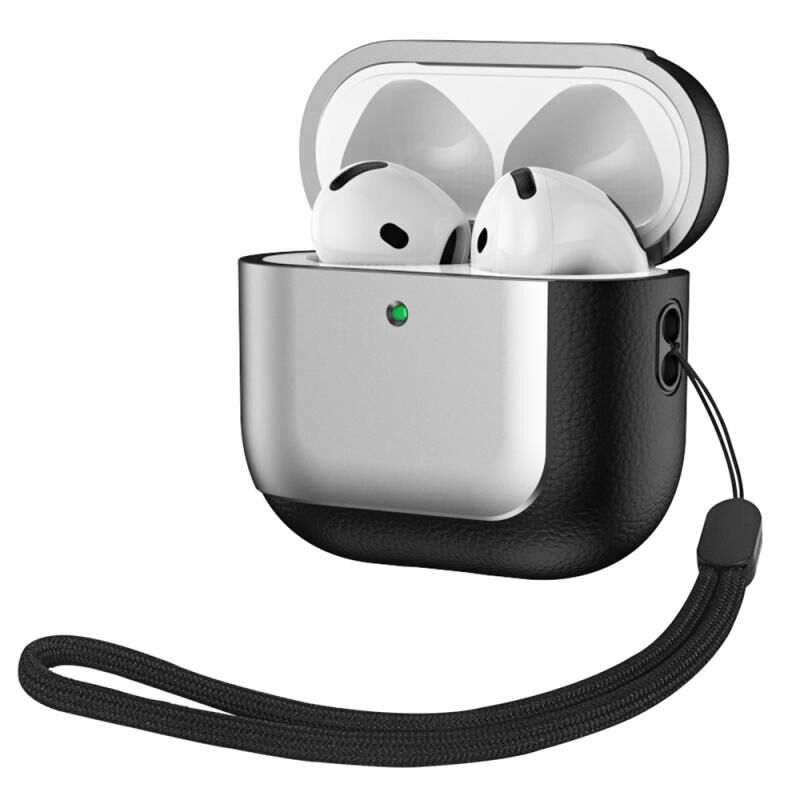 For AirPods 4 Electroplating Leather Texture Wireless Earbuds Box Protective Case(Grey)