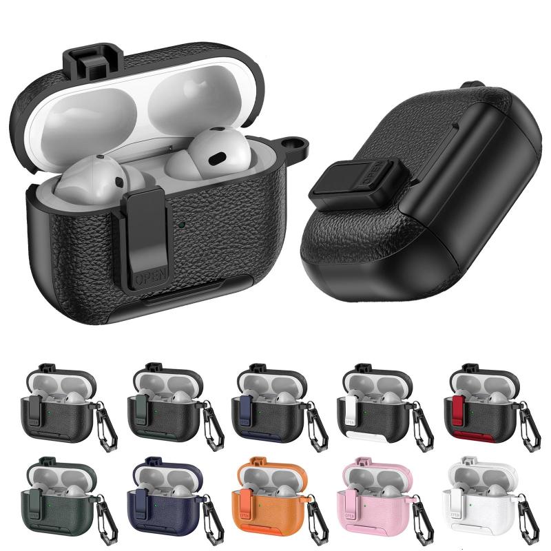 For AirPods Pro Leather Texture Wireless Earphones Case with Hook & Holder(Orange)