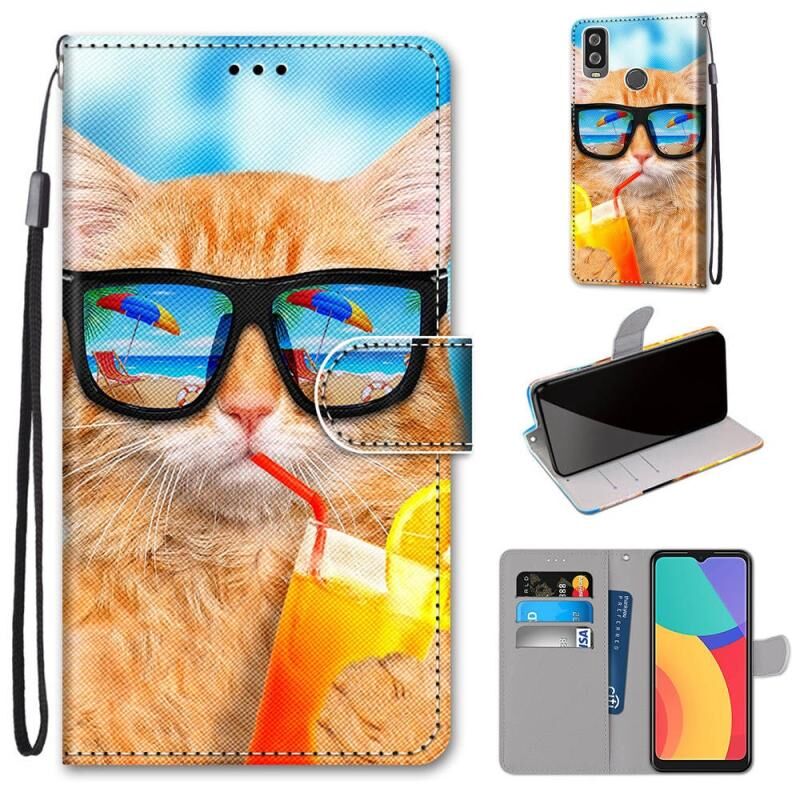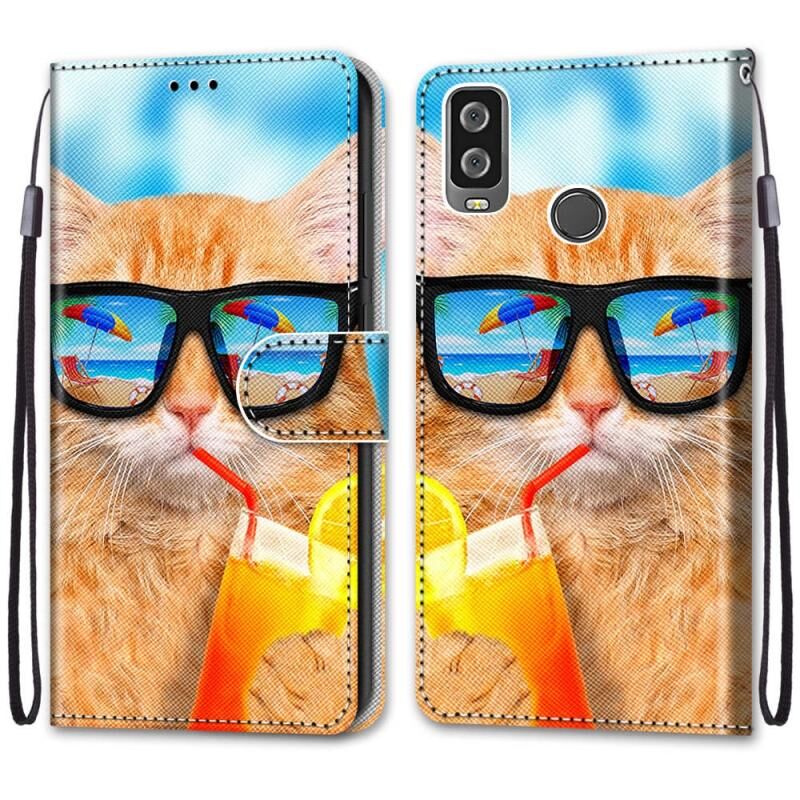 For Alcatel 1L (2021) Coloured Drawing Cross Texture Horizontal Flip PU Leather Case with Holder & Card Slots & Wallet & Lanyard(Cat Drinking Soda)