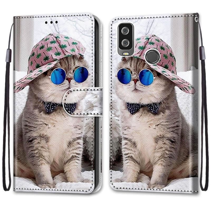 For Alcatel 1L (2021) Coloured Drawing Cross Texture Horizontal Flip PU Leather Case with Holder & Card Slots & Wallet & Lanyard(Slant Hat Blue Mirror Cat)