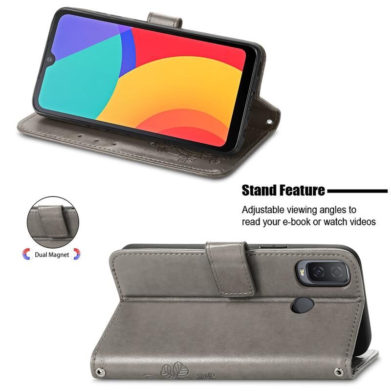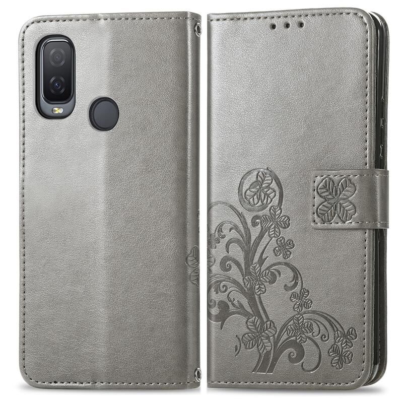 Θήκη δερμάτινη για Alcatel 1L 2021 με σχέδιο τριφυλλιού, ανάγλυφο κούμπωμα, προστασία κινητού, λουρί, θήκη για κάρτες, πορτοφόλι και λειτουργία βάσης (Χρυσό ροζ)