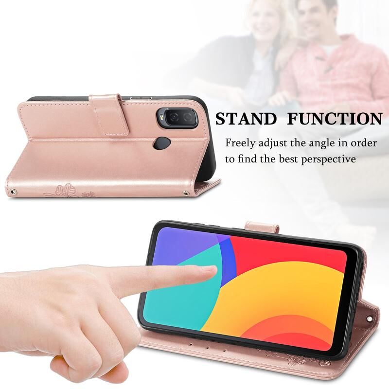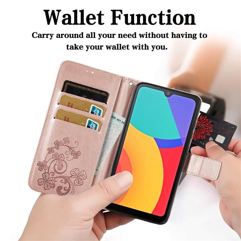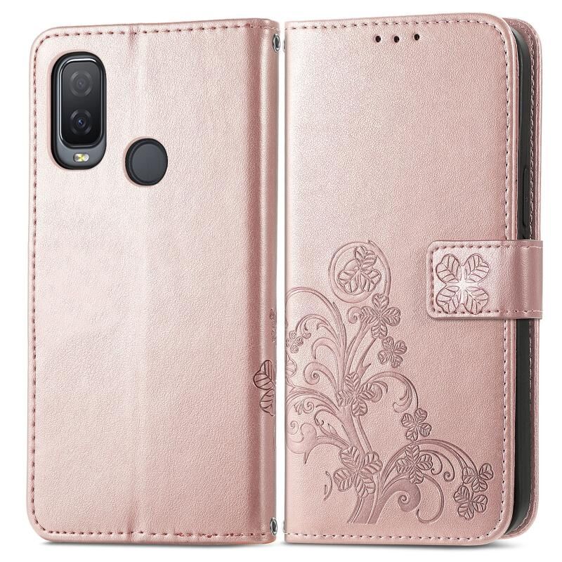 Θήκη δερμάτινη για Alcatel 1L 2021 με σχέδιο τριφυλλιού, ανάγλυφο κούμπωμα, προστασία κινητού, λουρί, θήκη για κάρτες, πορτοφόλι και λειτουργία βάσης (Χρυσό ροζ)