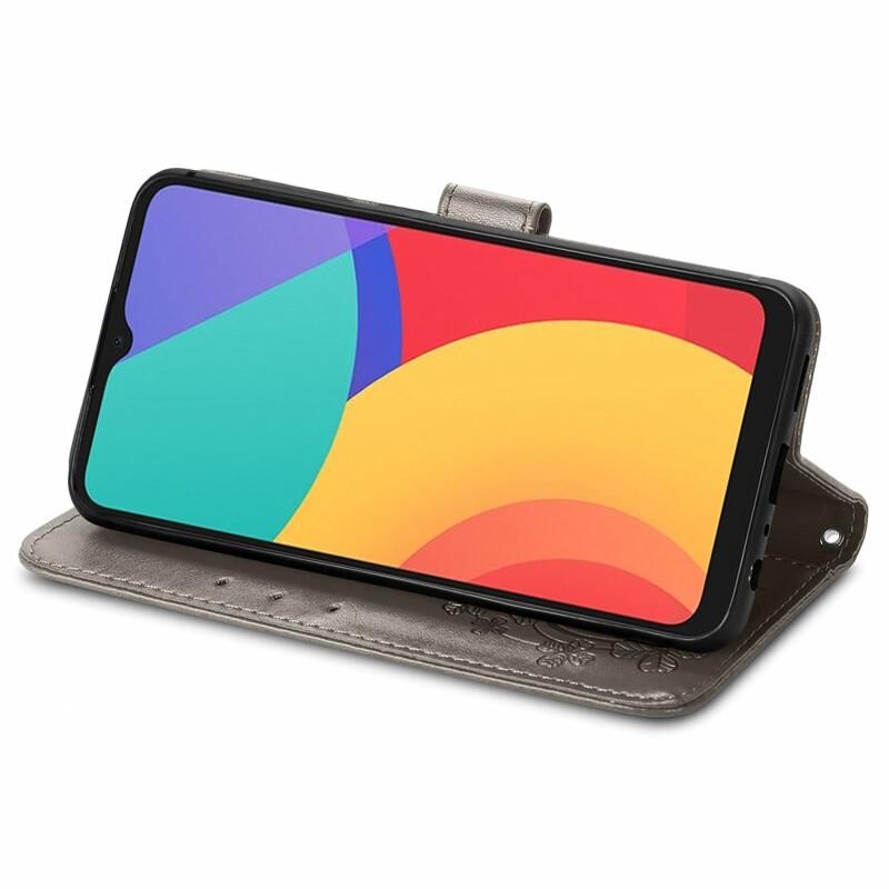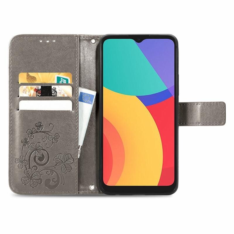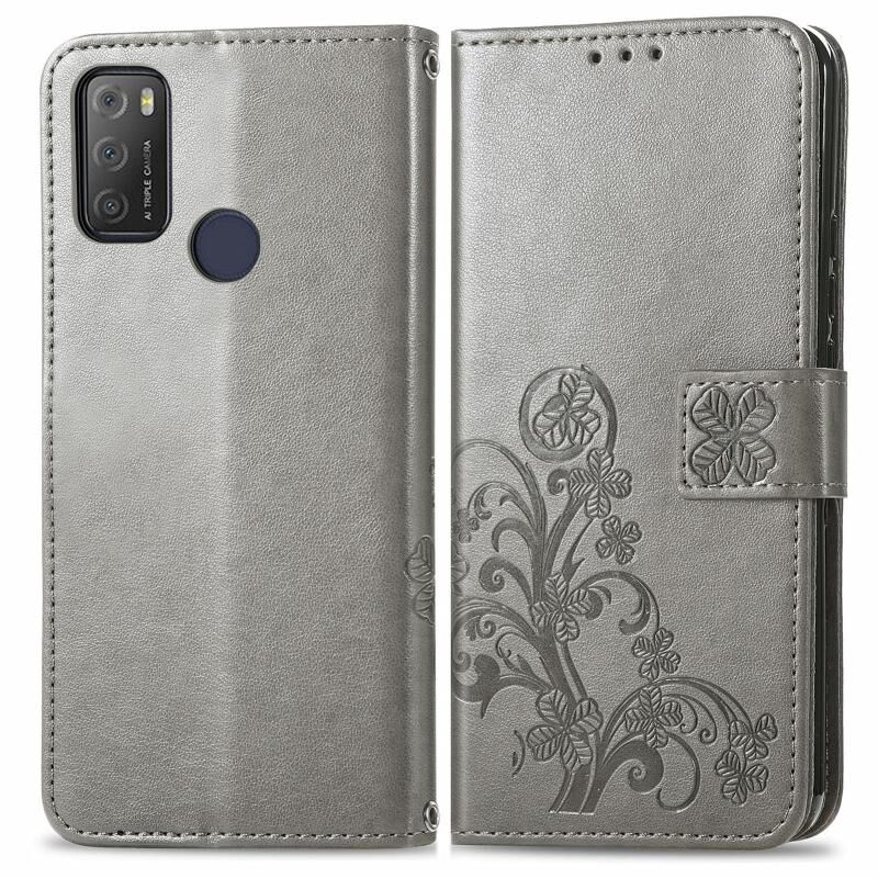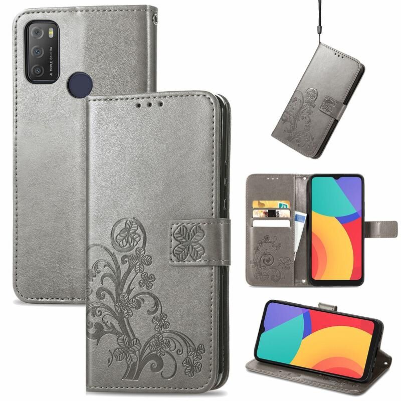 Για Alcatel 1S 2021 τετράφυλλο κούμπωμα ανάγλυφο αγκράφα κινητό τηλέφωνο προστασία δερμάτινη θήκη με κορδόνι & υποδοχή για κάρτες & πορτοφόλι & βραχίονα λειτουργία (γκρι)