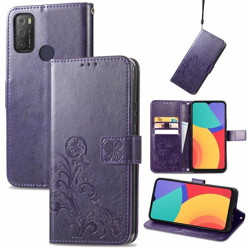 Για Alcatel 1S 2021 Τέσσερα φύλλα κούμπωμα ανάγλυφο αγκράφα κινητό τηλέφωνο προστασία δερμάτινη θήκη με κορδόνι & υποδοχή κάρτας & πορτοφόλι & βραχίονα λειτουργία (μωβ)