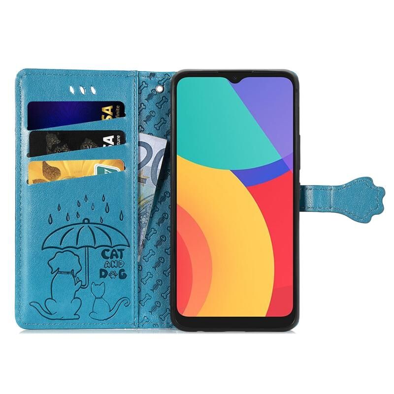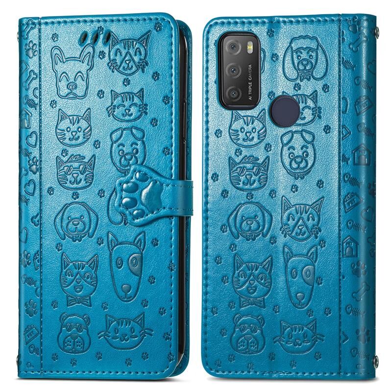 Θήκη Alcatel 1S 2021 με χαριτωμένο σχέδιο ανάγλυφου γάτας και σκύλου, οριζόντια δερμάτινη θήκη με βάση, θήκες για κάρτες, πορτοφόλι, κούμπωμα καρτούν και κορδόνι (Μωβ)