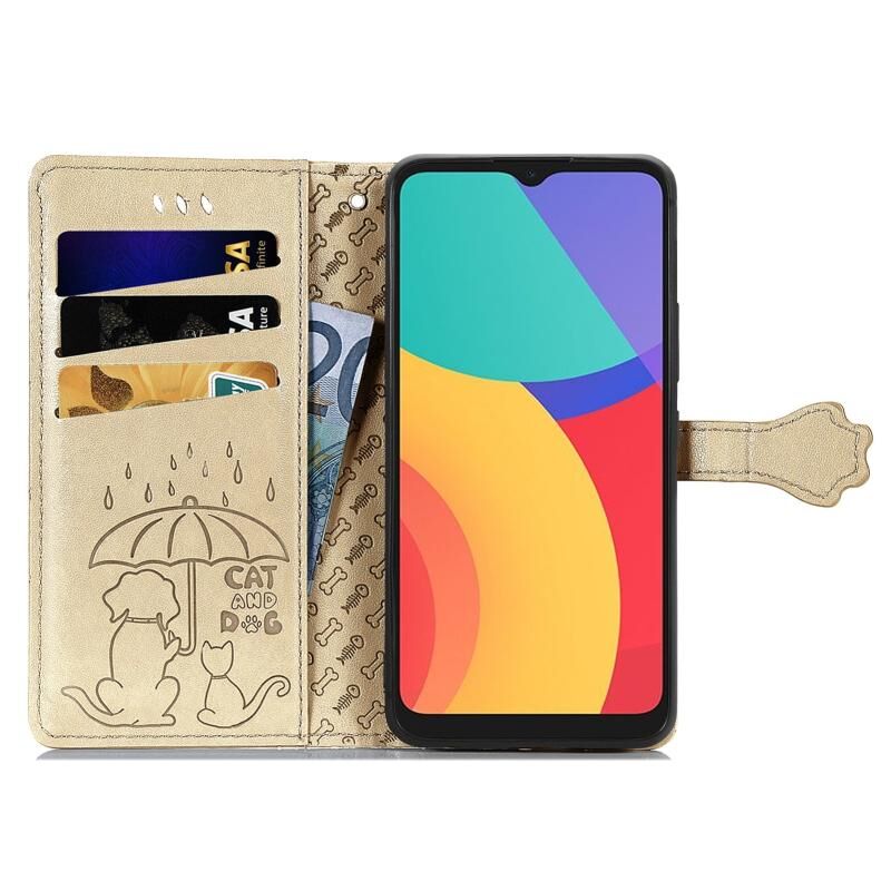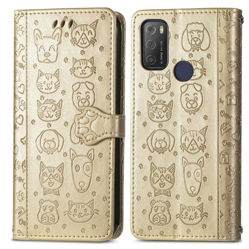 Θήκη Alcatel 1S 2021 με χαριτωμένο σχέδιο ανάγλυφου γάτας και σκύλου, οριζόντια δερμάτινη θήκη με βάση, θήκες για κάρτες, πορτοφόλι, κούμπωμα καρτούν και κορδόνι (Μωβ)
