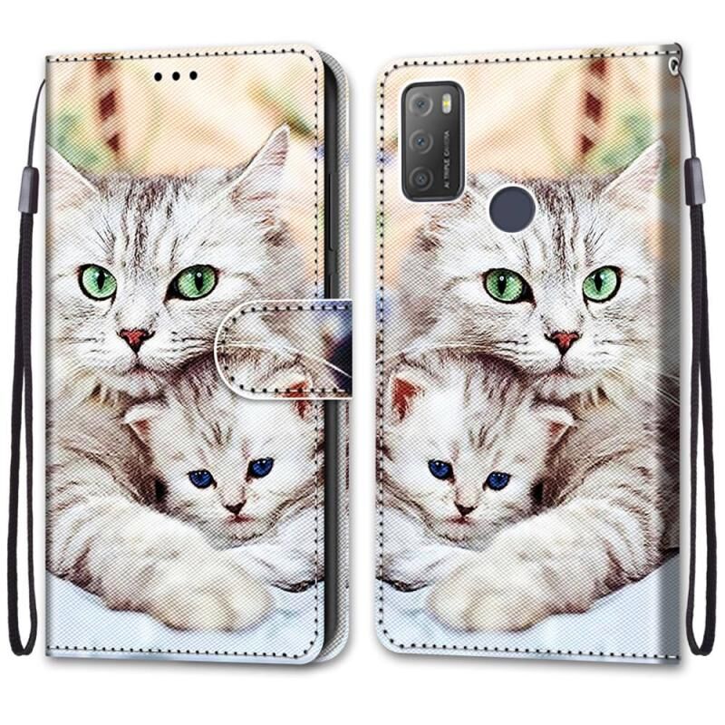For Alcatel 3L 2021 Coloured Drawing Cross Texture Horizontal Flip PU Leather Case with Holder & Card Slots & Wallet & Lanyard(Big Cat Holding Kitten)