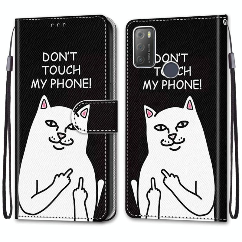 For Alcatel 3L 2021 Coloured Drawing Cross Texture Horizontal Flip PU Leather Case with Holder & Card Slots & Wallet & Lanyard(Middle Finger White Cat)