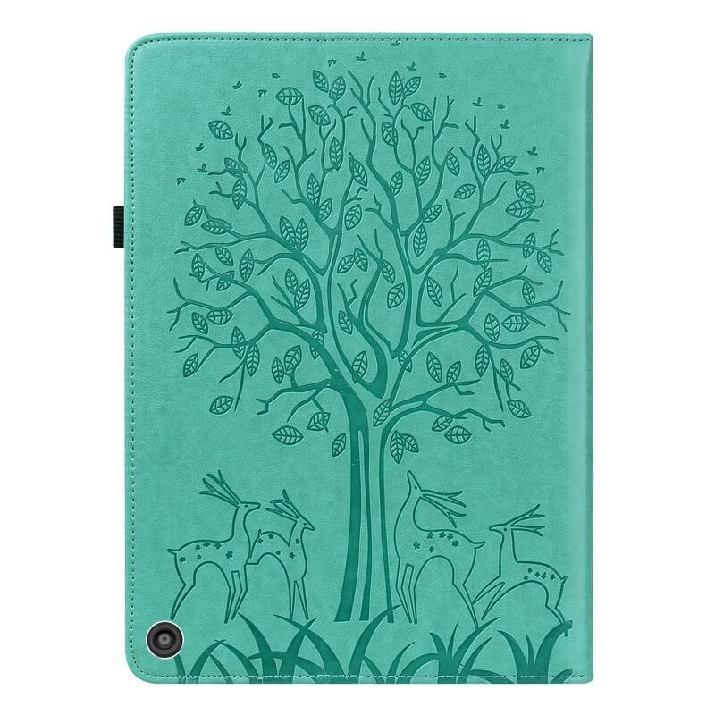 For Amazon Kindle Fire HD 10 / 10 Plus 2021 Tree & Deer Pattern Pressed Printing Horizontal Flip PU Leather Case with Holder & Card Slots(Green)