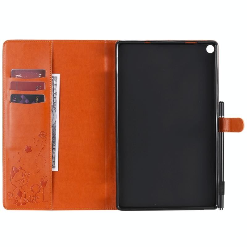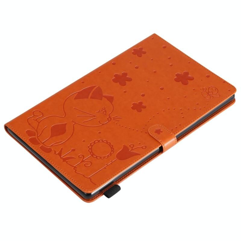 Θήκη προστασίας τύπου βιβλίου από δέρμα με ανάγλυφο σχέδιο γάτας και μέλισσας για Amazon Kindle Fire HD 10 (2015) / (2017), ανθεκτική σε κραδασμούς, με υποδοχές για κάρτες, πορτοφόλι, υποδοχή για στυλό και λειτουργία αδράνειας/επαναφοράς (Πορτοκαλί)