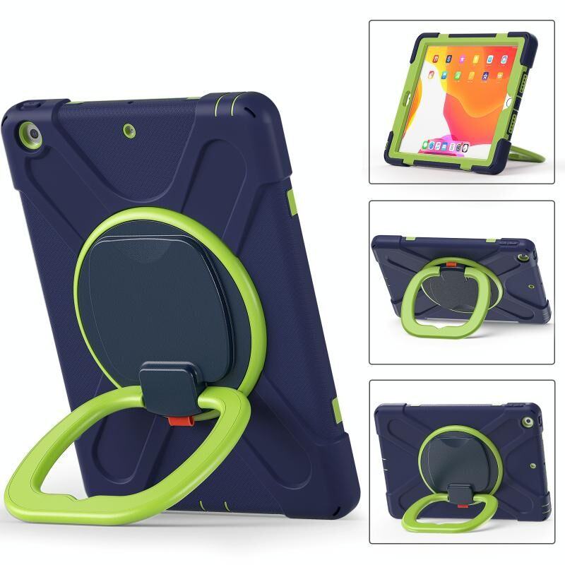 For Apple iPad 10.2 2021 / 2020 / 2019 Contrast Color Silicone + PC Protective Case with Holder & Shoulder Strap(Navy Blue + Yellow Green)