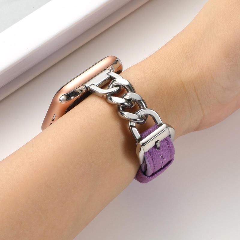 For Apple Watch 42mm / 41mm / 40mm / 38mm Metal Chain Leather Denim Watch Band(Purple)