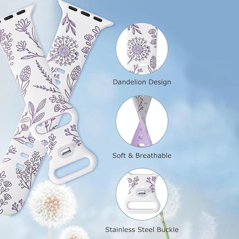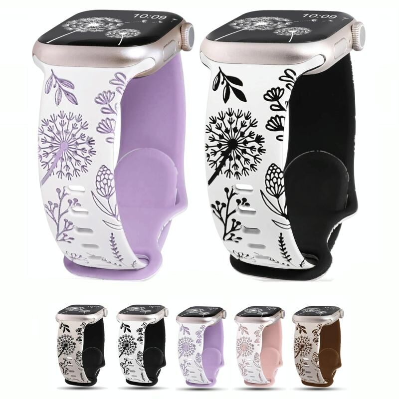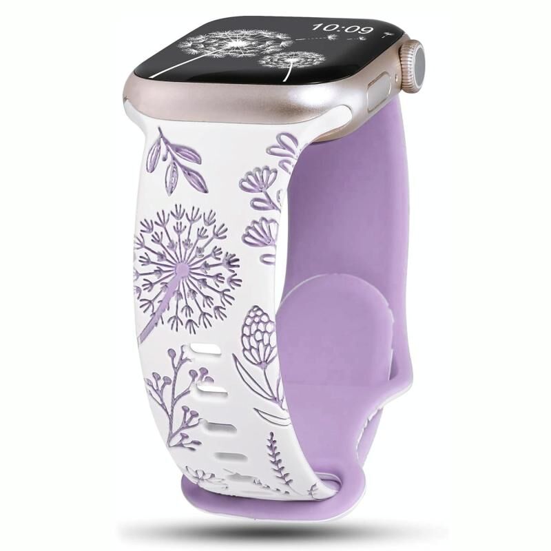 For Apple Watch 42mm / 41mm / 40mm / 38mm Two Color Dandelion Engraved Silicone Watch Band(White Purple)