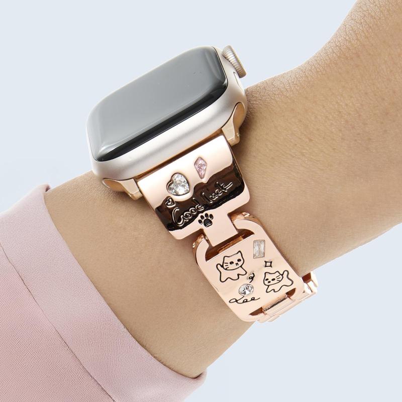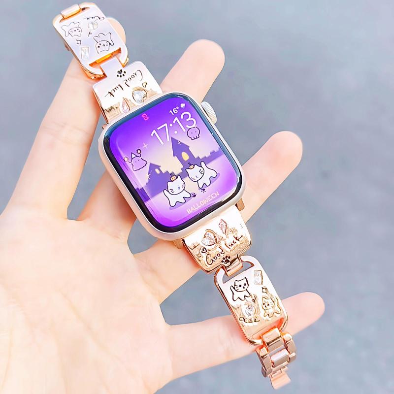 For Apple Watch 46mm / 49mm / 45mm / 44mm Colored Diamond Cat Stainless Steel Watch Band(Rose Gold)