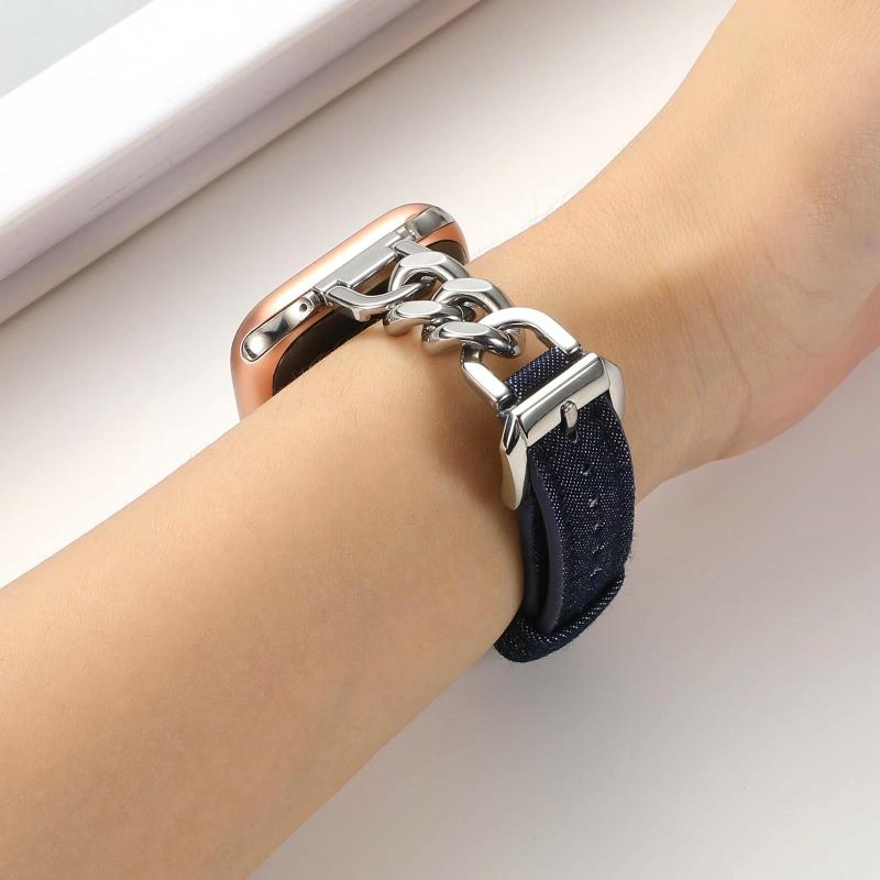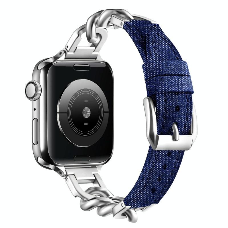 For Apple Watch 46mm / 49mm / 45mm / 44mm Metal Chain Leather Denim Watch Band(Dark Blue)