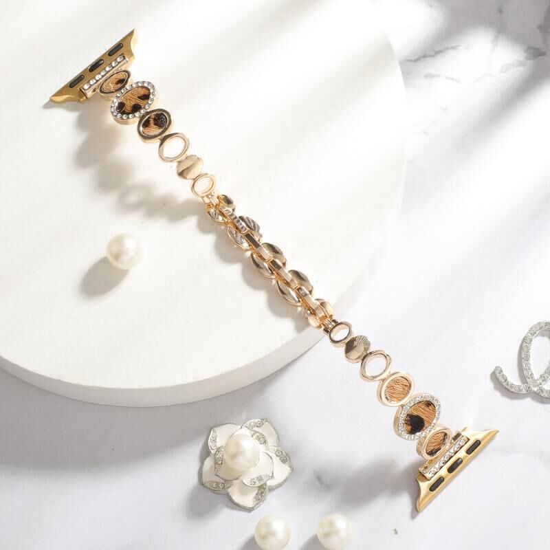 For Apple Watch SE 2022 40mm Leopard Rhinestones Metal Chain Watch Band(Gold)