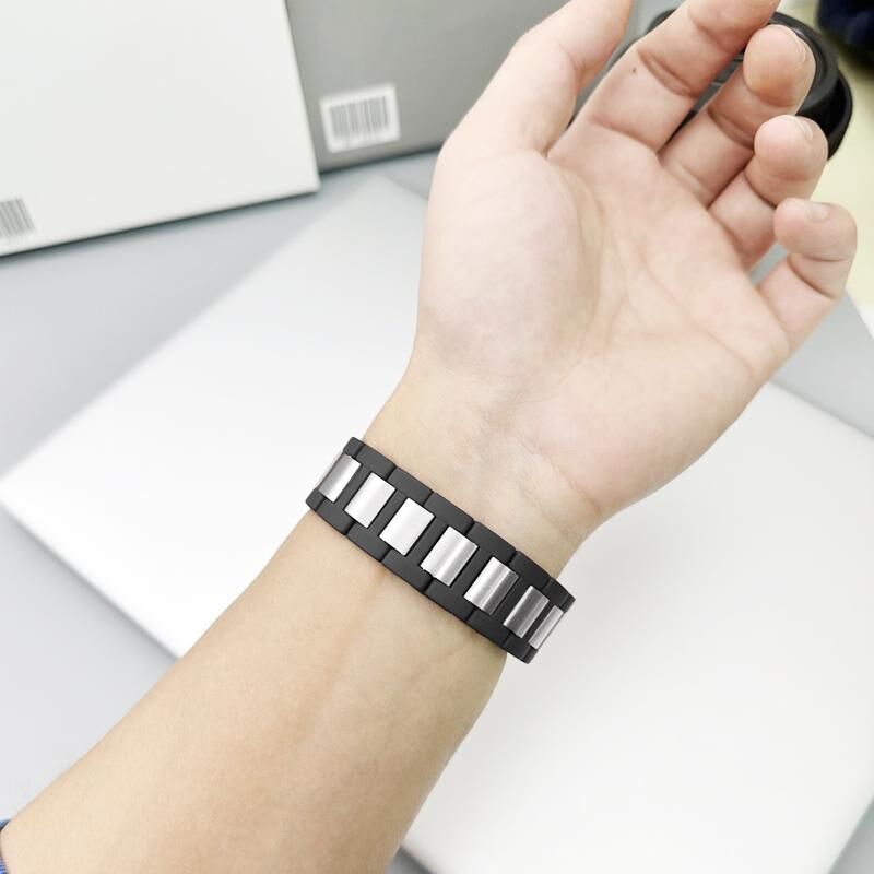 Για Apple Watch SE 2022 44mm Λουράκι Ρολογιού Μαγνητικό από Καουτσούκ και Ανοξείδωτο Ατσάλι (Μαύρο + Ασημί)