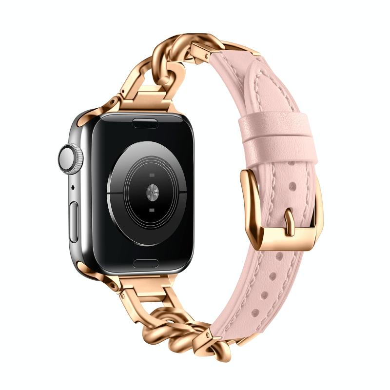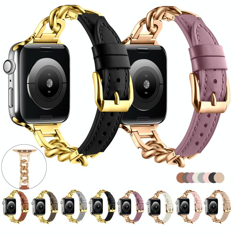 Για Apple Watch SE 2023 40mm Αλυσίδα Αυθεντικό Δερμάτινο Λουρί, Μέγεθος: L (Χρυσαφί Σκούρο Καφέ)