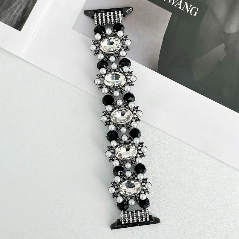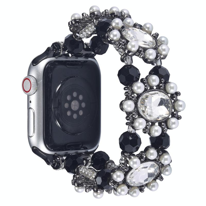 For Apple Watch SE 2023 44mm Beaded Pearl Gemstone Bracelet Watch Band(Black)