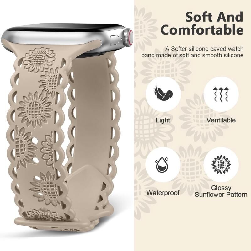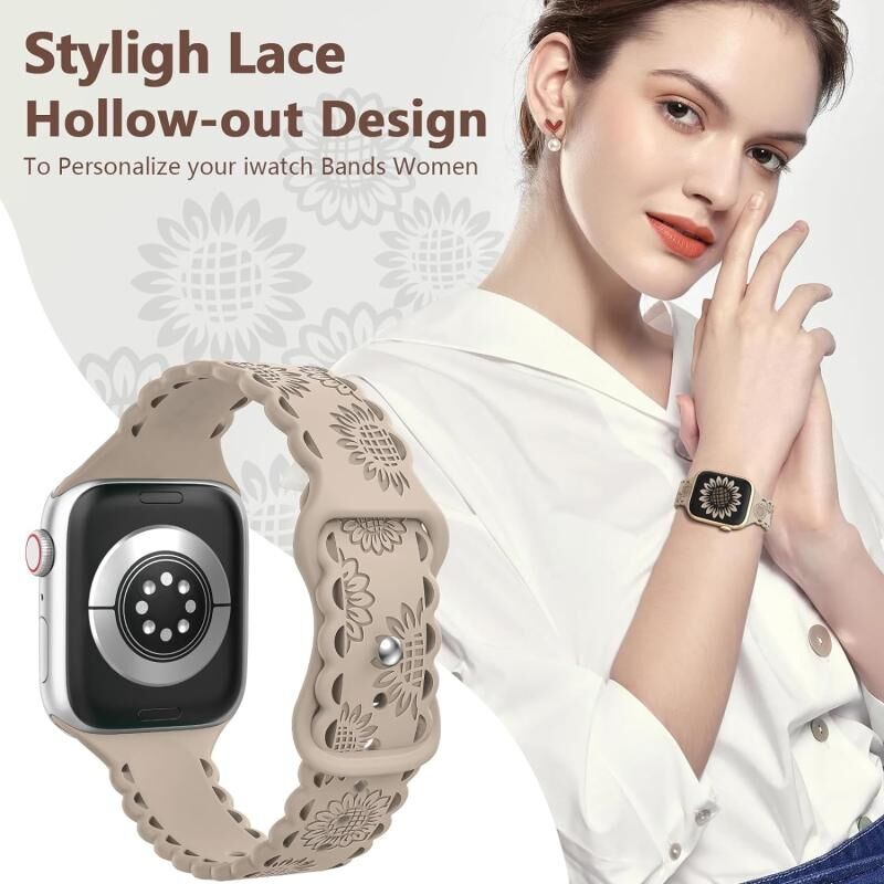 Για Apple Watch SE 2023 44mm Δερμάτινο Λουρί Σιλικόνης με Δαντέλα και Χαραγμένο Ηλιάνθου (Γαλακτώδες Τσάι)