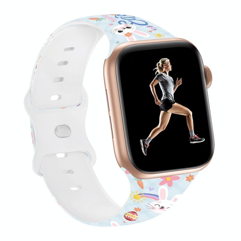 For Apple Watch SE 44mm Butterfly Buckle Easter Printed Silicone Watch Band(Bunny Blue)