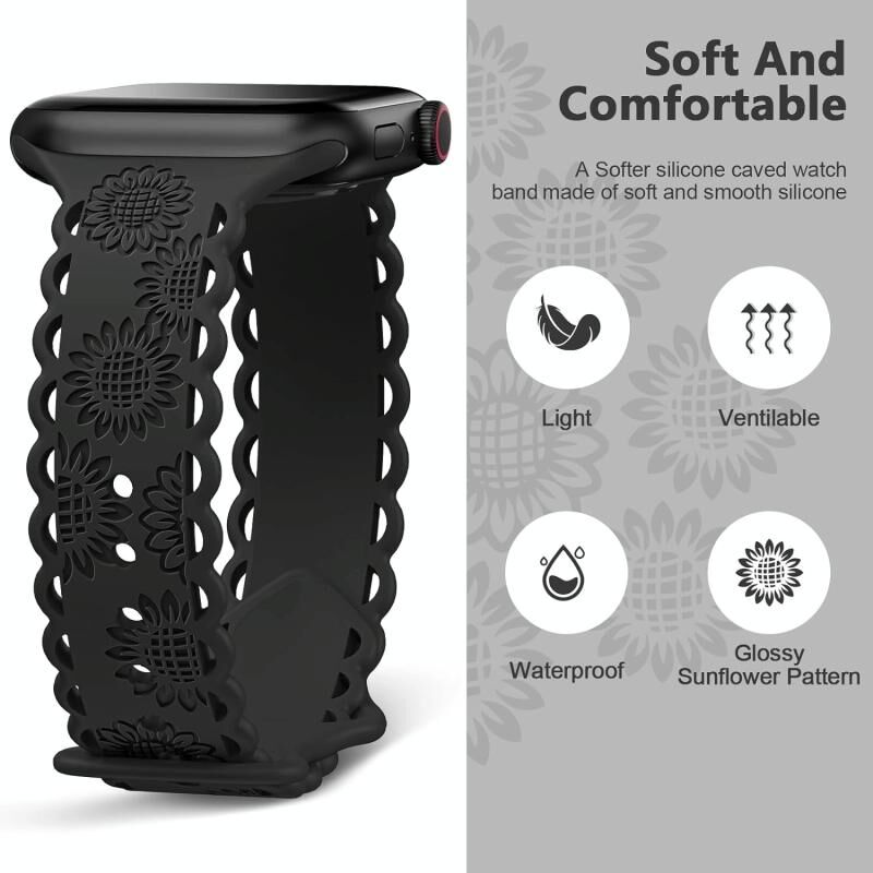 Για Apple Watch SE 44mm Λουρί Σιλικόνης με Δαντέλα και Χαραγμένο Ηλιάνθου (Μαύρο)